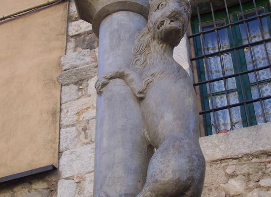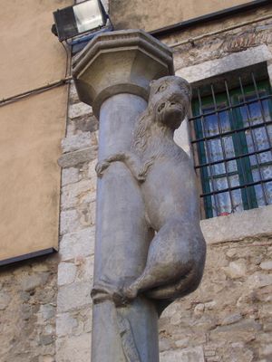 Aquest particular monument, que podria ser que fos part de l’Hostal la Lleona que portava a terme la seva activitat en les immediacions de la columna, forma part d’una bonica costum entre els Gironins. Diu la llegenda que qui vol ser bon gironí i no marxar mai de Girona o, si se n’ha d’anar, tornar-hi, ha de fer un petó al cul de la lleona.