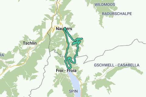 I Nauders fører ruten først ad Doktor-Tschiggfrey-Straße mod nord til Karl-Blaas-Gasse og til højre foran Sankt Valentin-kirken. Ved krydset Schweinhag Pazöhlgasse følger man rute 7038 ad en skovvej i sydøstlig retning. Efter ca. 1,7 kilometer drejer man til højre og cykler let opad ind i Brandwald, indtil skovvejen efter 900 meter munder ud i en skovsti. Hold nu til højre og følg rute 7038 videre ind i Piengtal. Før hotel Jochelius, det tidligere bjergrestaurant Goldseehütte, kryds Piengbach og kør tilbage mod dalens indgang på den anden side af bækken. Nu går det i flere hårnålesving under Lärchenhangliften og bjergstationen Bergkastel 6,1 kilometer opad til Stieralm på 2.040 meters højde. Herfra begynder Plamort-Trail, der fører videre mod syd forbi Kompatschwalds opbevaringsdam og til sidst over den italienske grænse til den højtliggende slette ved Plamort. I højmosen følg igen rute 7038 mod Clopai og Arlundo ved Reschensee. I Arlundo drej til højre ind på Vinschgauer Straße og efter 1,3 kilometer skift til Vinschgauer cykelsti ved Reschen via undergangen. Parallel til hovedvejen fører ruten nu forbi Reschen og over den østrigske grænse tilbage til Nauders. På vej tilbage passeres dalstationen for Bergkastel-liften med indkøbsstedet Arsangs og en E-cykellade station.
