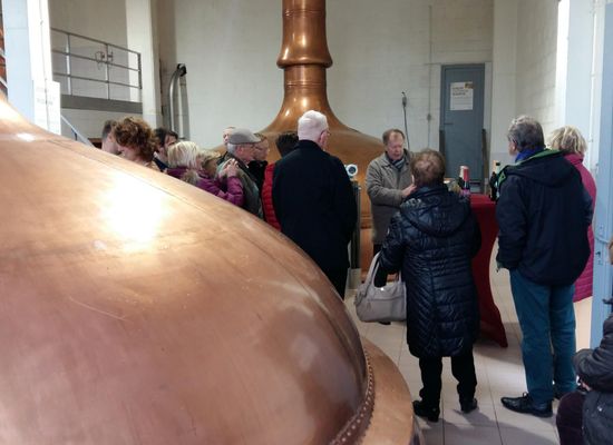 De smukke kobbergryder fra bryggeriet kan også ses udenfor gennem de store vinduer.