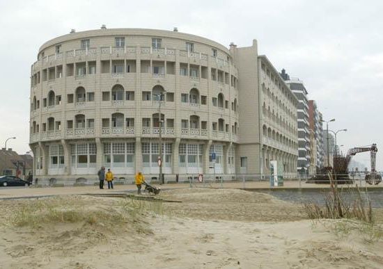 Tidligere "GRAND HÔTEL BELLE VUE", også kaldet "ROTONDE". Beskyttet som monument (facader og tage) ved B.V.E. den 27.04.1983, udvidelse af beskyttelsen til interiøret ved M.B. den 10.11.1995. Opført ved den yderste østgrænse af badebyen mellem 1909 og 1911, på opdrag fra N.V. "Grand Hôtel Belle Vue" efter design af aktionær og arkitekt Octave Van Rysselberghe (Ninderhout). Det oprindelige koncept forsøgte at skabe en forsoning mellem en streng neo-palladisk klassicisme og cottage-arkitektur i en for sin tid fremadskuende pre-modernistisk struktur. Van Rysselberge designede en rektangulær bygning, bestående af to fløje med et centralt rektangulært indre, som var indrettet som dansesal; mod øst sluttede den markante amfiteaterformede forbygning eller rotonde sig til. Konstruktionsmetoden var nyskabende: et skelet af armeret beton blev belagt med naturstensplader, hvorimellem fugerne blev malet i en kontrasterende farve. Hotellet hadede ved åbningen i juni 1911 et hundrede og tyve værelser, to elevatorer og seksten kar med varmt havvand. Første Verdenskrig påførte hotellet betydelig skade, hvorefter der mellem 1920-1924 fandt en første restaurering sted. Den eksisterende bygning blev brugt som udgangspunkt; gennem en betydelig forenkling opnåede den dog et mere modernistisk præg: de specifikke cottage-elementer som for eksempel det røde tegltag på mansardetagen blev udeladt og erstattet af en femte etage; den sydlige fløj blev efter ødelæggelsen af 1914-18 ikke mere genopbygget i sin helhed og reduktioneret til to etager samt vestbygningen, som indeholdt havbade og en solterrasse. I 1951-1952 blev hotelværelserne omdannet til individuelle lejligheder. Den nuværende bygningsvolumen på forhøjet stueetage og under fladt tag omfatter den halvcirkelformede forbygning af elleve travéer og fem etager; den tilstødende vestfløj af elleve travéer og fem etager under fladt tag; lav tilbygning af to etager mod vest og syd. Stærkt rytmisk facadesten under mere med gennemgående pilastre ved rotonden. Tilbagetrukket kælderetage med halvt indskrevne karnapper ved rotonden og overdækkede loggier i vestfløjen. I den halve forbygning eller rotonde er stueetagen indrettet som spisesal, som oprindeligt omfattede hele halvrunden. Interiøret viser en indretning i klassisk stil; den oprindelige farvesammensætning er kun delvist bevaret. Spisesalen består af et cirkulært buet rum, med karnappede vinduer i hver af de 11 travéer. Indenfor er dette rum indrammet af en sokkel, der på bunden har pseudo-ioniske søjler med rillet skaft på indsnævret sokkel, som understøtter loftet; mellem søjlerne ses trapper og en balustrade. Velbehandlet stukarbejde af vægdekorationen og architraven. I endevæggen er en rundbue-nis udarbejdet. Loftet består af et spil af trekantede, staggerede kassetter. Parketgulvet viser et fiskebensmønster. Rummet mellem rotonden og dansesalen indeholder blandt andet trappehuset, den tjenestetrappe og det tidligere fumoir. Det monumentale trapperhus omfatter elevator-skaftet med en stigen rundt om, som har lige fodtrin, afbrudt af repos med palier. De massive gelændere er ret afsluttet mod lift-siden og trapformet mod ydersiden. Trapperhuset er udført i terrazo af lavere kvalitet og synes at være ombygget. Den monumentale dansesal er nu delvist fyldt med soveværelserne og lagerpladserne fra de foranliggende lejligheder. Hele bygningen var oprindeligt tænkt som et atrium eller indre gård, hvis lange side via en søjlerække hver gang gav ud til to mindre sideværelser. Den korte side indbefattede blandt andet en sceneplatform. Den oprindelige indretning af rummet er nu kun delvist bevaret. Søjlerækken med seks par koblede pseudo-ioniske søjler og to halv-søjler er forsvundet, men af hovedkonstruktionen og kassetloftet er væsentlige dele blevet bevaret. Den anden, tredje og fjerde etage indeholder lejlighederne. De forskellige etager er tilgængelige via trappekonstruktionen mod sydfacaden og tjenestetrappen bag rotonden. Udførelsen pr. etage er ensartet og består af en U-formet gang over dansesalen og en halvcirkelformet gang i rotonden. Vinduesrammerne på paneldørene har en sober klassicistisk afslutning med tre kassetter, rillet døromkreds og profileret overligger. Lejlighederne har en fire-delt grundplan med stue, soveværelse, køkken og badeværelse.