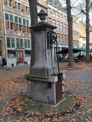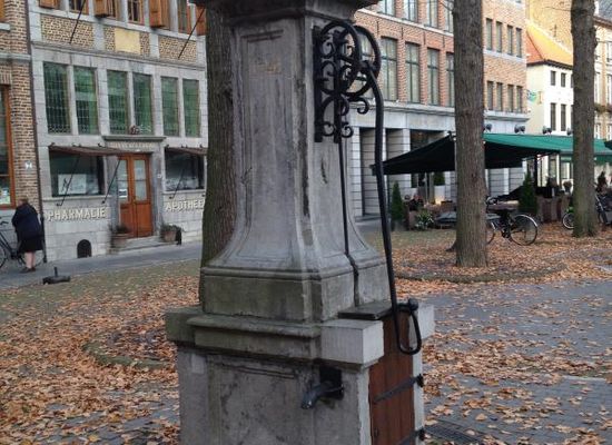 Historisk vandpumpe på hjørnet af Maaseiks marked.