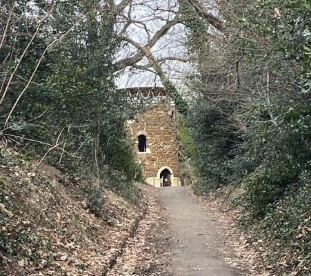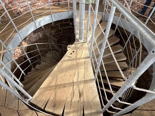 Ruten fører os videre til den gamle mølle på Molenberg. “Indtil 2020 var der kun en forvitret ruin her,” fortæller Pieter. “Også denne vindmølle blev sat i brand under 1. verdenskrig.” I mellemtiden sørgede de nødvendige konsolideringsarbejder for at bevare den. “Det er stadig en ruin, men en der ikke kan forfalde yderligere.” Hver første søndag i måneden kan den besøges. “Vær især opmærksom på den særlige dobbelte helix trappe,” deler han også. “En sådan trappe finder du blandt andet i Vatikanet.”