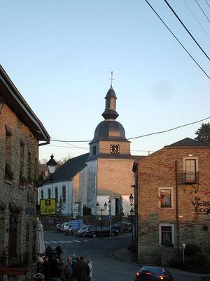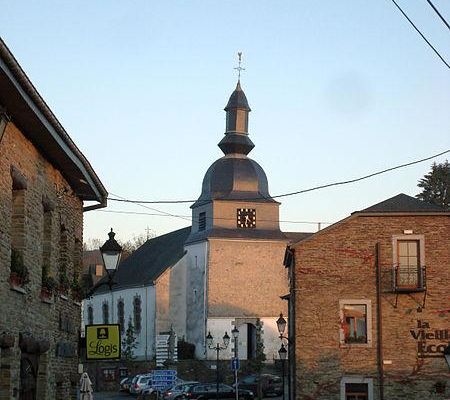 Bygningen i skifer er omgivet af den gamle kirkegård og en mur af sandsten og skifer. Hele området blev classified den 13. januar 1977 af Kommissionen for monumenter og steder, efter en anmodning fra abbed Marenne i 1965. En første bygning, sandsynligvis et kapel, blev opført i 1139 og efterlod som rest en døbefont. Den nuværende kirke har været på plads siden 1773.