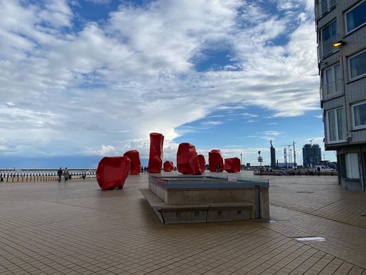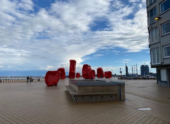 Kunst på diget i Oostende. Kunstværk 'Rock Strangers' af Arne Quinze.
