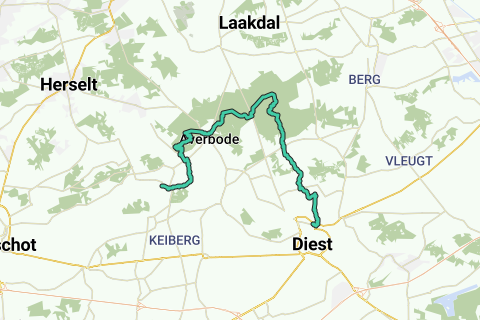Fra stationet i Diest går vi straks op ad til det smukke Fort Leopold, og derefter langs den militære lufthavn i Schaffen, hvor faldskærmssoldaterne lærer at springe. Gennem det skovrige landskab nord for Diest når vi naturområdet Gerhagen, som sammen med de Averboodske skove og heder udgør et af de største sammenhængende skovområder i Flandern. Udbredte nåleskove, hedeområder, smukke søer... nogle gange er det svært at forestille sig, at man stadig er i Vlaams-Brabant. I midten af denne grønne hav ligger det majestætiske Averbode Kloster, med den tilhørende brasserie. Derefter opholder vi os et stykke tid i skov- og hedeområdet, mens ruten går ned mod Demerdalen. Vi passerer de idylliske Demerbroeken og når den lille station i Testelt.
