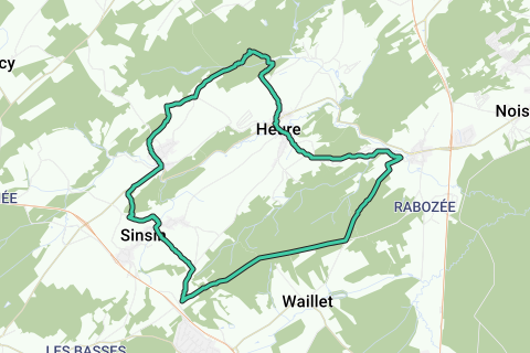 Vi begynder med en opstigning på en kilometer, først på asfalt men skifter til singletrack. Vi når toppen af et arbejde fra Les Sentiers d'Art: Le chemin des 4 lunes. Efter en flad strækning begynder en nedstigning som ved les Vennes foregår uden asfalt indtil åen Le Bouchet, hvor vi igen kommer på asfalt. Nu går det op ad i 4 km. Lige før Baillonville drejer vi til højre ad en grusvej. Efter en venstre og en højre ankommer vi til avenue de Waillet, efter hvilken vi når den højeste punkt på turen i Bois d'Heure.