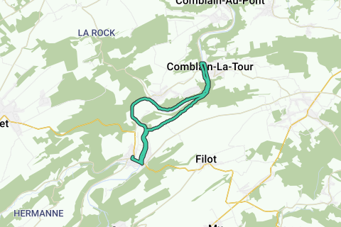 Følg højre bred af Ourthe i retning mod landsbyen Xhignesse, hvor du kan beundre den romanske Skt. Peterskirke. Den er klassificeret som vigtig arv fra Vallonien. Tæt på ligger den såkaldte Tombeu-bakketop, en gammel merovingisk gravplads, der blev opdaget i slutningen af 1960'erne. Gå ned i skoven til floden, tæt på Les Rochers de la Vierge. Klipperne skylder deres navn til Mariastatuen, der befinder sig halvvejs oppe i det imponerende kalkstensklippemassiv (klipper, der står op som skiver af brød, derfor kaldet 'tartines' på fransk). Kryds broen og følg igen floden, kryds derefter campingpladsen. Fortsæt indtil landsbyen Fairon. Her kan du eventuelt lave en ekstra sløjfe på 5,4 km i retning mod Bloquay og skovene ved Comblain. Ellers følger du bare Ourthe tilbage til afgangsstedet.