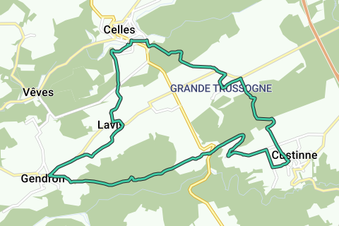 Smukt kredsløb, der starter fra Celles, en af de "Smukkeste Landsbyer i Vallonien", en landsby, der kan prale med en åndeløst smuk romansk kirke, en vidunderlig stenkorsvej og Hadelinushermitagen, der vogter over denne charmerende landsby fra en bakketop. Udforsk landsbyerne og bygderne Grande Trussogne, Payenne, Gendron og Lavis, før du vender tilbage til landsbyen for et lækkert glas Saint-Hadelin øl eller den lokale specialitet, chausson cellois (bladdej fyldt med blandt andet kaninkød).