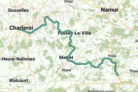 Ved afgangen fra Charleroi er industrien langs Samber meget til stede. Så snart du forlader floden, kort efter Falisolle, kommer du ind på RAVeL, der er helliget Félicien Rops. Landskabet nær Mettet er kendetegnet ved marker og enge. Via højderyggen kommer du til RAVeL ved Molignée. På denne gamle jernbanelinje Linje 150 kørte køretøjerne fra kalkstensbruddene gennem den bucoliske dal. Gennem tunneler og broer, som hver især er kunstværker, når du den lille kunstnerby Maredret. Klostrene Maredsous og Maredret ligger tæt på. Denne dal har meget at byde på! Endnu mere skønt finder du i landsbyen Sosoye, en af de Smukkeste Landsbyer i Vallonien. Den kaldes også landsbyen Montagnards, et kælenavn der hænger sammen med kalkstensbjerget, der dominerer landskabet. Undervejs passerer du også ruinerne af det middelalderske slot Montaigle, hvor du har en fantastisk panoramaudsigt. Når du nærmer dig Anhée, åbner den lille dal sig. Længere fremme munder Molignée ud i Maas...
