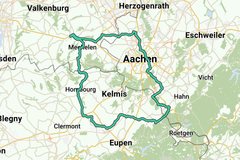 Start/slut: hjørnet af Marktstraat/Rijksweg Gulpen. Stigninger: følger Højdemeter: 772. Kaffe-stop: Bahnhofscafé, Langenbend 49, Raeren (B).