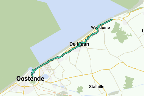 Vi brugte Oostende som vores udgangspunkt og tog altid kysttrampen til og fra afgangs- og ankomstpunktet. Jeg har derfor altid trukket ruten videre til stoppestedet for kysttrampen. I dette tilfælde er det Oostende station som afgang og Wenduine Harendijke som ankomst. Hvis færgen ikke sejler, er Oostende - Oosteroever eller Vismijn dit bedste valg.