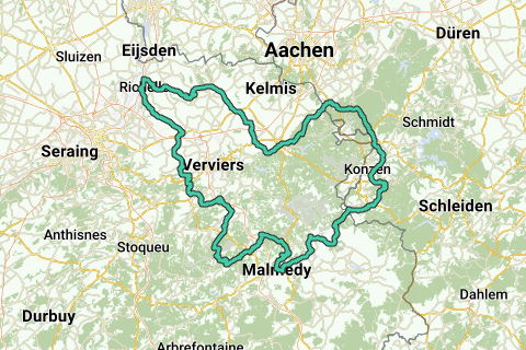Hagelstein – Saint-Jean-Sart – Val-Dieu – Mortroux – Dalhem – Visé – Argenteau – ∆ Richelle – St.Remy – ∆ Blegny – ∆ Bolland – ∆ Herve – ∆ Xhendelesse – Soiron ∆ – Cornesse – Pepinster – Juslenville – ∆ Oneux – ∆ Sassor – Sasserotte – Polleur – ∆ Bansions – ∆ Tiège – ∆Nivezé – ∆∆ Rosier-Quest – Andrimont – ∆ Neuville – ∆∆ Francorchamps – ∆ Ster – ∆ Hockai ∆ – Mont – Bévercé – Malmedy – ∆ Chôdes – ∆ G’Doumont – ∆ Agister – ∆ Walk – ∆ Robertville – links Chemin de Cheneux “KASTEEL REINHARDSTEIN” – ∆ Ovifat – ∆ Sourbrodt – Bosfagne – Küchelscheid – ∆ Kalterherberg – Rohren – Widau – ∆∆ Grünentalstrase – Imgenbroich – Am Gericht – Simmerath – Paustenbach – Lammersdorf – Rott – Schmithof – Walheim – Raeren – Neudorf – Eupen – Membach ∆ Baelen – ∆ Heggen – Welkenraedt ∆ Henri-Chapelle – Merckhof – Hagelstein.