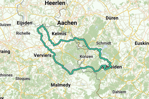 Teuven – Obsinnich – Middelhof – Hombourg – Gulpen – Henri-Chapelle – Welkenraedt – Lanceaumont – Herbestal – Rabotrath – Walhorn – Belven – Raeren – Schmithof – B258 – Rotterdell – Rott – Hahner Strase – Waldsiedlung – Lammersdorf – Rollesbroich – Strauch – Steckenborn – Woffelsbach – Rurberg – Einruhr – B266 – Heilstein – Morsbach – Herhahn – Scheuren – Schleiden – Bronsfeld – Am Mühlenberg – Harperscheid – Berescheid – L207 – B258 – Alzen – Kalterherberg – Küchelscheid – 72 – 71 – 86 – 83 – 80 – 52 – Rue de Botrange – Baraque Michel – Jalhaye – La Gileppe – Goé – Limbourg – Dolhain – Bilstain – Quatre-Chemins – Elsaute – Clermont – RAVEL linje 38 til Aubel – Magis – S.P.V. – Krindaal – De plank – Teuven.
