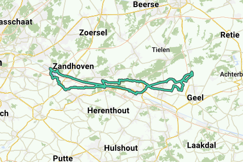Fra Oelegem Kirkegårdvej-Albertkanaal-Vierseldijk-Grobbendonk-Herentals-Veldhoven-Herentals-St Jozef Olen-Mosselgoren-Thys Ten Aard-Rauwelkoven-OLV Olen-Herentals BLOSO-Kl Nete-Grobbendonk-Bouwel-Kl Nete-Broechem-Oelegem...
