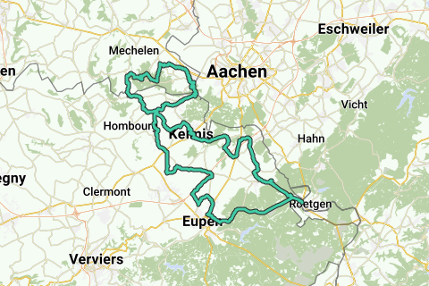 Rundtur Voerstreek 7 fra Vijlen. Start/mål: boscafé 't Hijgend Hert, Rugvej, Vijlen. Stigninger: Smidsberg Epen 1.500 m., max. 7,0%. Vennkreuz vest (delvist) 5.700 m., max. 8,0%. Eupen (B) Rue Les Trois Bornes Gemmenich (B) 2.200 m., max. 6,0%. Harles Vijlen 700 m., max. 9,0%. Rugvej Vijlen 1.200 m., max. 8,0%. Ruten har også flere navnløse stigninger. Højde meter: 1.117 Kaffe stop: Kaffeefee, Petergensfeld 94, Roetgen (B) (1 mar - 30 nov dagligt åbent).