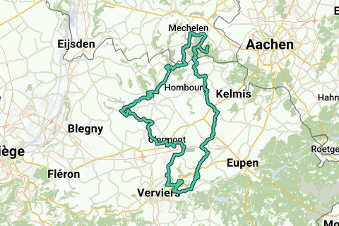 Rundtur Voerstreek 20. Start/mål: boscafé 't Hijgend Hert, Rugweg, Vijlen. Stigninger: Mur de Limbourgh Limbourgh (B) 800 m., max. 16,0%. Rampe de Rencupré Andrimont (B) 1.700 m., max. 14,0%. Mur Grises Pierres Val-Dieu (B) 500 m., max. 16,0%. Rue Chateau Magis Aubel (B) 1.800 m., max. 5,0%. Kasteelstraat Teuven (B) 1.200 m., max. 10,0%. Pannisberg Vijlen 3.600 m., max. 7,0%. I ruten findes også flere navnløse stigninger. Højde meter: 1.265 Kaffe stop: Au Renouveau, Place de la Halle 4, Clermont (B) eller Le Fourquet, Centre 50, Thimister (Spørg på forhånd begge steder, om de er åbne. Der cirkulerer forskellige åbningstider og -dage på internettet).