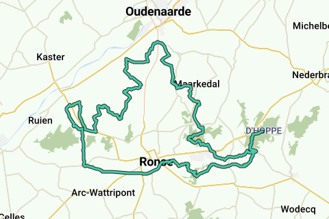 En tur, der starter på et hyggeligt sted, Brasserie d'Hoppe, her kan du få en god kaffe i en dejlig atmosfære. Du kan dog starte ved Ronsse station (ruten passerer forbi stationen). Du vil få mange stille veje, og gennem de flamske Ardenner passerer du Oude Kwaremont, Paterberg, Koppenberg & Taaienberg. Alle veje er tilladt at cykle på, og du vil passere nogle smukke skove og fine grusveje. Nogle grusveje krydrer ruten. Men aldrig for teknisk. Jeg ville dog ikke anbefale en racerdæk her.