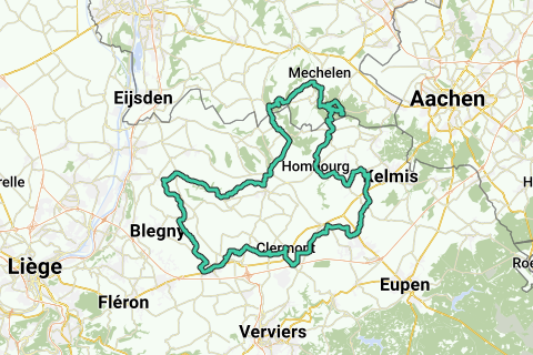 Rundtur Heuvelland 27 fra Slenaken. Start/slut: stor parkeringsplads ved foden af Loorberg Slenaken. Stigninger: Grensweg Slenaken 400 m., maks. 10,0%. Dorpsstraat/ Kultjen Remerdaal (B) 2.400 m., maks. 7,0%. Chemin de Crêtes Saint André (B) 1.700 m., maks. 6,0%. Chantraine (delvist) Clermont (B) 500 m., maks. 10,0%. Cottessen/Camerig (delvist) Vijlen 3.300 m., maks. 8,0%. Schweiberg Mechelen 2.700 m., maks. 9,0%. Højde meter: 1.140. Kaffepause: Au Renouveau, Place de la Halle 4, Clermont (B). (Tlf. 0032-87-446527. Spørg om de korrekte åbningstider, da der på internettet står forskellige lukketider).