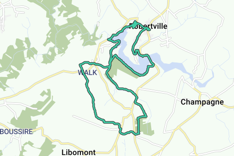 Denne vandring består af 2 eksisterende sløjfevandringer, der flyder sammen. Vi starter ved kirken i Robertville. Følg først skiltningen med Gul Rektangel. Den går et stykke langs Robertville Sø allerede over dæmningen. Efter en god 2 km skifter vi over til sløjfevandringen med Rødt rektangel. Denne fører os væk fra "Søen" til og gennem landsbyen med det ideelle navn, WALK. Da vi er tilbage ved starten af den røde sløjfe, skifter vi tilbage til sløjfevandringen med det Gule rektangel (lige frem, ikke til venstre fra hvor vi kommer). Nu går vi rundt om "Søen" indtil vi når udgangspunktet. Turen er ca. 12 km lang