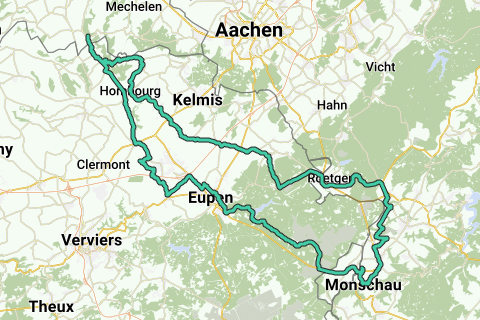 Rundtur Slenaken-Monschau-Slenaken 2. Start/slut: stor parkeringsplads ved foden af Loorberg Slenaken. Stigninger: Grænsevej Slenaken 400 m., maks. 10,0%. Rue de Remersdael Hombourgh (B) 4.500 m., maks. 5,0%. Kaperberg Eupen 900 m., maks. 10,0%. Eupen-Entenpfuhl-Mützenich (B/D) 13.500 m., maks. 10,0%. Alte Monschauer Straße Imgenbroich (D) 2.000 m., maks. 10,0%. Petergensfeld Roetgen (B) 800 m., maks. 5,0%. Rue de Hombourgh Montzen (B) 2.100 m., maks. 7,0%. Rue de Beusdael Sippenaeken (B) 2.800 m., maks. 8,0%. I ruten er der også flere navnløse stigninger. Højde meter 1.321. Kaffepause: café Kaulard, Markt 8, Monschau (D). (åbningstider følger)