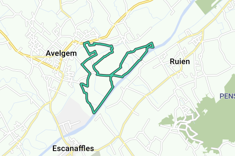 Naturområdet Avelgemse Scheldemeersen ligger mellem den gamle jernbanestrækning, Schelde, Rijt og Rugge. Området er opdelt i forskellige nybrud eller afskårne Scheldemeander (17.-18. århundrede) som nybrud Marcel Deweer, Beskidt nybrud, Prærienybrud og Miracoupure. Dannelsen af Scheldedalen går tilbage til istiden, og dette skyldes stærk strømming af smeltende isvand, der forårsagede aflejring af sand og grus. Afgang Meersstraat 45, Avelgem, parkering kan ske ved virksomheden (ved spidsen til højre). Naturpædagogisk Center ligger længere fremme ad den grusede sti (som vi passerer sidst på gåturen). Desværre er gåkortet (på hjemmesiden og brochuren, der fås gratis ved informationsskiltet) ikke tilpasset de søjler i marken, især på den røde rute. Der er tre ruter: Naturlæringssti (grøn, 6 km), Tør (?) føddersti (rød, 6 km) og Mellem Rijt og Schelde (blå, 7 km). Denne gps-vandring er en kombination af stier med et lille stykke langsom vej for at omgå passagen i Ruggestraat.
