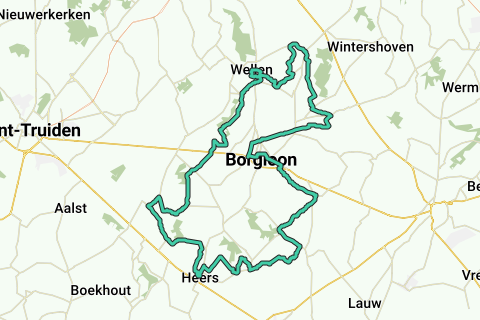 Borgloon er det ubestridte centrum af Haspengouws frugtområde. Frugtområde-museet, sirupsfabrikken og frugtauktionen giver bestemt regionen en ekstra tiltrækningskraft. Æble-, pære-, blommer- og kirsebærplantager er en del af denne tur. Haspengouw når højder på 80 til 131 meter. Jordfordeling fra 1970'erne og 1980'erne har skabt et netværk af betonveje her. Cykelryttere får fordel af dette. Denne rute bringer dig tæt ved sproggrænsen, gennem stille landsbyer og forbi gårde, der grupperer sig omkring kirker.