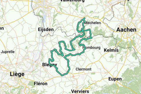 Rundtur Voerstreek 14 fra Slenaken. Start/mål: stor parkeringsplads ved foden af Loorberg Slenaken. Stigninger: Koning van Spanje Gulpen 1.700 m., max. 10,0%. Smidsberg Epen 1.500 m., max. 7,0%. Rue de Beusdael (delvis) Sippenaeken (B) 1.700 m., max. 8,0%. Kloosterhofstraat Sinnich (B) 2.000 m., max. 7,0%. Smidt-Mabrouck Remersdael (B) 3.000 m., max. 6,0%. Holliquette Val-Dieu (B) 1.200 m., max. 6,0%. Côte de Bouxhmont Battice (B) 2.200 m., max. 10,0%. Thier Fouarge Bolland (B) 700 m., max. 12,0%. Glos du Grand Sart Mortroux (B) 1.700 m., max. 10,0%. La Heydt Warsage (B) 4.900 m., max. 9,0%. Krindaal/de Planck Veurs (B) 1.600 m., max. 10,0%. Gieveldstraat Teuven (B) 1.500 m., max. 6,0%. I ruten er også flere navnløse stigninger. Højdemeter: 1.360. Kaffe-stop: brasserie A vi Blégny, Entre-deux-Villes 3, Blégny (B) (ma lukket).