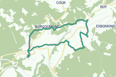 Afgang: Parkering ved kirken Rue de l’Eglise – busstop La Gleize Centre (TEC 142). Stå med ansigtet mod kirken til venstre. Første gade til højre og til hovedvejen til venstre. Du passerer busstop. Første gade til højre (mod Spa). Følg nu 5 km turen med den røde rektangel. 150 m længere, smallere vej til venstre. Ved kapellet til højre. Forbi en bolig vil du komme ind i skoven og krydse Nabonruy (1) over en træbro. Drej til højre over en stenbelagt sti. Hvis denne sti er for våd, kan du til højre følge en parallel sti lidt højere oppe i skoven. Ved X af stier til venstre (rød rektangel, mod Borgoumont). Til asfaltvejen til højre. 100 m længere, vil du komme til landsbyen Borgoumont (2), hvor du kort til venstre for 50 m tilbage, forbi en balustrade, tager den nedadgående vej skarpt til højre (fortsat rød rektangel). Følg ligeud. Forbi det sidste hus kommer du til en allé med hækbech. 1,5 km længere, forbi en kilde hvor vandet strømmer ud af en rørledning (Fontaine des Nymphes) (3), drej til højre for 50 m for at tage stien til venstre. Ved en deling til højre. Til højre ved vejen. 175 m videre, lige over broerne af Roannay (4) og Ru dè Neu, forlader du de røde tegn og følger ligeud den grønne rektangel. Du går gennem den pittoreske landsby Moulin du Ruy (5). Ved krydset 150 m forbi kirken tager du den smalle vej til højre. Tag den højre af de to ved delingen (bemærk til venstre over en bro en smuk frugtplantage). Følg nøje de grønne tegn. Ved T vejen til højre og ved næste T til venstre af asfaltvejen. 550 m videre, efter en ret lang opstigning, går du til højre over en stenbelagt markvej. Der følger endnu en ret stejl opstigning. Ved en T går du til højre og når du er ude af skoven ved en X igen til højre – nedadgående asfaltvej med smukke udsigter. I landsbyen Roanne (6) går du på en bredere vej kort til venstre og næsten straks skråt til højre. Du bevæger dig ned til dalen og går nedenunder til højre over Roannay (4) (Pont de Roanne). Til venstre vil du igen komme ind i den røde rute og forlade den grønne. 150 m forbi broen til højre. Ved den næste T fortsæt til højre og følg den røde rektangel indtil La Gleize. Til hovedvejen til venstre og 175 m længere Rue de l’Eglise til højre til parkering.
