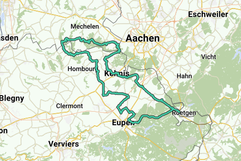 Rundtur Voerstreek 32 fra Slenaken. Start/slut: stor parkeringsplads ved foden af Loorberg Slenaken. Stigninger: Loorberg Slenaken 1.500 m., max. 8,0 %. Camerig vest Vijlen 4.600 m., max. 8,0 %. Vaalserberg Vaals 3.600 m., max. 8,0 %. Petergensfeld Raeren (B) 3.400 m., max. 12,0 %. Rue de Beusdael Sippenaeken (B) 2.800 m., max. 8,0 %. I ruten er der også flere navnløse opkørsler. Højdemeter: 1.249 Kaffepause: Kaffeefee, Petergensfeld 94, Roetgen (B) (1 mar - 31 okt åbent/man. lukket).