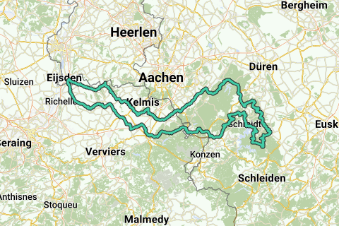 Teuven – Remersdaal – Hombourg – Montzen – Busch – Astenet – Walhorn – Raeren – Sief – Walheim – Hahn – Breinig – Breinigerberg – Vicht – ∆ Bend – Schevenhütte ∆ – Groshau – Kleinhau – Brandenberg – Obermaubach – Zerkall – Brück – Abenden – Lübbenau – Blens – Hausen ∆ – Heimbach – ▲ Mariawald – Hasenfeld – ∆ Scheidam – Geisief (Schmidt) – Froitscheidt – Mausbach – ∆ Vossenack – ∆ Simonskall ▲ – Rollesbroich – Lammersdorf – Waldsiedlung – Petergensfeld – mod Eupen – Kettenis – Herbesthal – Welkenraedt – Henri-Chapelle – Merckhof – Aubel - St.Jean-Sart – Val-Dieu - Motroux - Berneau - Moelingen - Withuis - Mesch - S.G.V. - S.M.V. - De Plank – Teuven