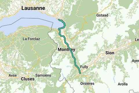 Ruten følger derefter bredden af Genfersøen (Lac Léman) til Montreux og følger derefter Rhone mod Martigny.