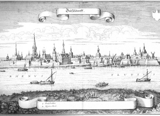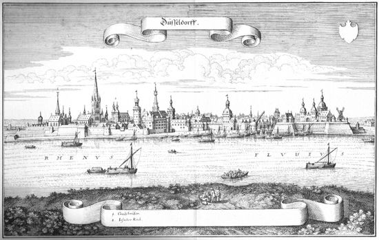 I 1288 fik stedet ved udløbet af den lille flod Düssel i Rhinen byrets. Fra slutningen af det 14. århundrede til begyndelsen af det 19. århundrede var byen regeringens sæde for lande i det hellige romerske rige og Rheinforbundet: Hertugdømmet Berg, hertugdømmerne Jülich-Berg og Jülich-Kleve-Berg samt storhertugdømmet Berg, fra 1690 til 1716 også residens for palatineren og kurfyrsten Johann Wilhelm von der Pfalz. Fra det 19. til det 20. århundrede var den parlamentets sæde for Rheinprovinsen i Kongeriget Preussen. I kejserriget udviklede Düsseldorf sig i takt med den høje industrialisering i Tyskland til "skrivbordet i Ruhrområdet", og med overskridelsen af mærket på 100.000 indbyggere i 1882 blev den til storby.