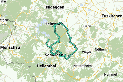 I den yderste nordlige del af ruten sænker du dig over en Landesstraße til Heimbach i dalen ved Rur-floden (nederlandsk: Roer). Heimbach er en smuk by, så det er bestemt værd at holde pause. En meget god restaurant i Heimbach er Zur Alten Mühle, beliggende i en historisk bygning omkring 200 meter fra ruten. Fra Heimbach følger længere stigninger. Og efter Heimbach er det allerede den længste på denne rute, nemlig på 5,5 kilometer til Kermeter: en højderyg syd for Heimbach. Under opstigningen passerer du Henriette Platz, et smukt udsigtspunkt over Roerdalen og Heimbach. Desværre er det sådan, at motorcyklister i weekenden også inkluderer denne stigning i deres ruter. B265 bruges som nedkørsel fra Kermeter til Gemünd (2,5 km). I Gemünd komme du hurtigt væk fra de travle veje og stiger op til Herhahn over stille indre veje for at undgå den travle Bundesstraße mellem Gemünd og Herhahn. Via Panzerstraße cykler du også tilbage til Vogelsang for at undgå Bundesstraße.