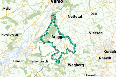 Via Elmpt går du til Elmpter Schwalmbruch, et naturområde omkring søer, der er udgravet i flodbunden af Swalm. Du cykler ikke direkte langs søerne, men gennem skovområde og langs hedeområde, der ligger lidt højere for at undgå mulig mudrethed fra grusveje lige langs disse søer. Derefter kommer du ud på den gennemgående vej mellem Swalmen og Brüggen. Du følger den kort ind til grænseovergangen (hvor du kan tage en pause ved Café "Aan de Grens"). Lige over grænsen dykker du ind i Diergardtscher Wald og senere Brachterwald over grusveje: her får du lange strækninger grus til dækkene.