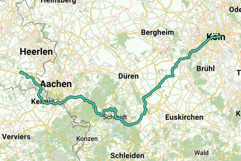 Start: hotel Stadspalais, Deutz-Kalkerstraße 52, Köln. Højde meter: 1.529. Finish: hjørnet af Marktstraat/Rijksweg Gulpen.