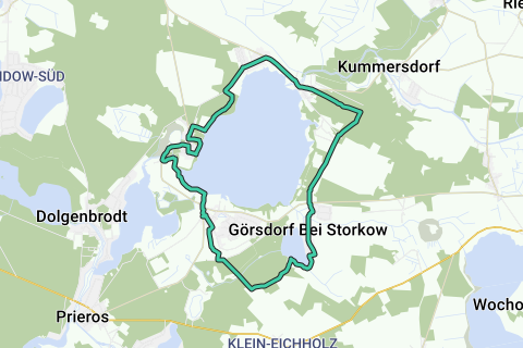 Fra busholdepladsen for linje 723 på L 40 i retning mod Kummersdorf/ Storkow vandres der til den Gamle Postvej. Drej til højre der, indtil det kendte naturmonument "Rødderfyr" passeres. Efter 600 m drej til højre ind i den grusede cykelsti i retning mod Görsdorf. I den videre rute krydses L 391, som forbinder Kolberg og Storkow. I Görsdorf fører vejen forbi den gamle markstenkirke til Kutzingsee. Ved pauserne er der en fantastisk udsigt over søen til Kolberg. Herfra fortsæt til højre langs søen for at forlade Kutzingsee mod Kolberg Landsby over for badeområdet. Ved foden af Kolberg kan man nyde udsigten over hestefolde mod Langer See. I Kolberg krydses byen, forbi busholdepladsen og værtshuset Alter Dorfkrug, indtil badeområdet nås. Dernæst fortsætter man langs Blossiner Fließ på den også afmærkede Fontane-vandresti (rød tværstribe) indtil L 39 er nået. Efter at have krydset den store bro, nås indgangen til Blossin efter 750 m. Efter infotavlen drejes til højre mod Dorfanger, forbi godset og videre til venstre, en kort strækning langs søen til fiskeriet ved Wolziger See med restauranten "Fischerhütte". Fortsæt over området for ungdomsuddannelsescentret Blossin, først ved søen, derefter en kort strækning ad en skovsti. Over L 40 nås udgangspunktet for vandreturen. (Tekst: Hans-Jürgen Mowinski)