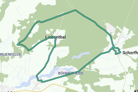 Rutebeskrivelse: Turen starter ved stationen Groß Schönebeck og fører gennem bymidten mod Schluft. Skønne alléer, lindetræer og egetræer pryder vejen indtil vejviseren Liebenthal. Et læskur inviterer til den første pause. Turen fortsætter ligeud gennem alléerne forbi Forsthaus, indtil man når til vildhesteindhegningen og kæledyrparken Liebenthal. Her er det en god idé at holde en pause og besøge den kærligt anlagte anlæg. På ca. 13 ha kan man beundre omkring 300 dyr (f.eks. æsler, svin, får) i rummelige indhegninger. De må ikke kun klappes, men det er også udtrykkeligt ønsket at fodre dem (foderposer fås ved kassen). Desuden kan trætte cyklister her nyde lækker duftende, hjemmelavet kage. Hvis man cykler ca. 400 m videre, når man legepladsen i Liebenthal. Et læskur giver også her mulighed for at nyde den medbragte picnic-kurv. I byens midte i Liebenthal holder man til højre, cykler forbi knudepunkt 77 for igen at cykle 4,5 km ad en frodig grøn allé til Hammer, her bliver det til venstre ind på Mittelweg mod Groß Schönebeck. Før man når frem til slutmålet, passerer man Böhmerheide. Den maleriske Hvide Sø indbyder med et dejligt baderedskab og en hyggeligt anlagt legeplads til det sidste stop. Så for varme sommerdage bør man absolut have badetøjet med, så man kan finde fornyelse i det klare vand i søen. Den sidste etape af denne tur fører tilbage til Groß Schönebeck gennem Schloßstraße. Her er det værd at tage et kig på det fredede jagtslot Schorfheide (udstillingen "Jagt og magt" kan besøges).