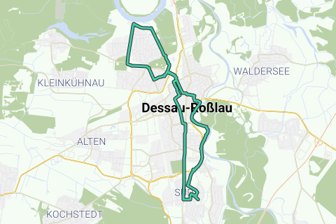 Hbf. Dessau – over Bitterfelder Straße til UCI-biografen – her til venstre over jernbanebroen – til højre ved Parkstraße – lige ud til dyreparken – gennem den røde og hvide bue til Georgenallee – langs Georgenallee til Elbpavillon – her til højre til Kornhaus – på Elballee mod syd – ved Ebertallee til venstre – mestervillaerne – rundkørsel "Syv søjler" – Gropiusallee til Bauhausplatz – til venstre til Bauhaus – Bauhausstraße til Seminarplatz – her til venstre til fodgængerområdet ved arbejdsagenturet – videre til Antoinettstraße – til højre over jernbanebroen til Bitterfelder Straße – til højre til hovedbanegården eller over Fritz-Hesse-Straße til sydruten.
