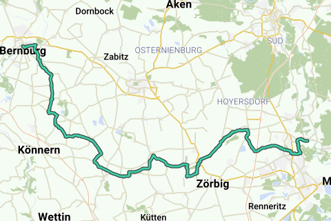 Bernburg - Baalberge - Kleinwirschleben - Leau - Lebendorf - Wiendorf - Ilbersdorf - Berwitz - Gröbzig - Werdershausen - Schlettau - Gottgau - Plötz - Glauzig - Görzig - Schortewitz - Priesdorf - Cösitz - Göttnitz - Löbersdorf - Radegast - Zehmitz - Zehbitz - Wehlau - Salzfurtkapelle - Reuden - Wolfen - Jeßnitz - Altjeßnitz