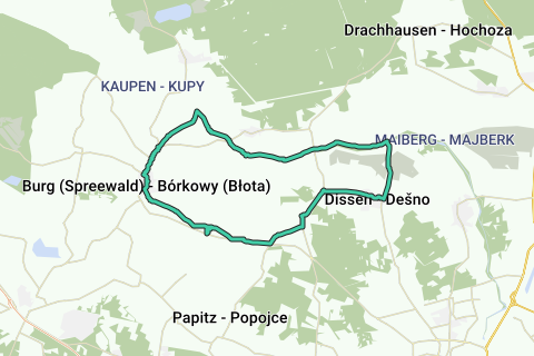 Denne cykeltur begynder og slutter ved turistinformationen i Burg i Spreewald. Først kan du besøge Heimatstube Burg, et stråtagdækket, spreewaldtypisk blokhus, hvor du kan se en lille, men fin historisk samling fra det historisk betydningsfulde sted Burg. Inden du fortsætter mod Schmogrow, bør du nyde udsigten fra Bismarcktårnet, der er 27 meter højt, over det unikke Spreewald-landskab. Turen fører dig langs Spree, forbi de grønne enge og auerochsenge i den renaturerede Spreeaue, til Dissen, som på grund af sine mange storkenester også kaldes Storke-by. Det kærligt drevne Heimatmuseum giver interessante indsigter i skikke og traditioner blandt sorberne/wenderne og huser en storkeudstilling. Turen går tilbage over Briesen, hvor du kan tage en pause ved den gamle Spreewaldstation for at stille den lille sult. Afslutningen på cykelturen kan ske i Spreewald Therme Burg.