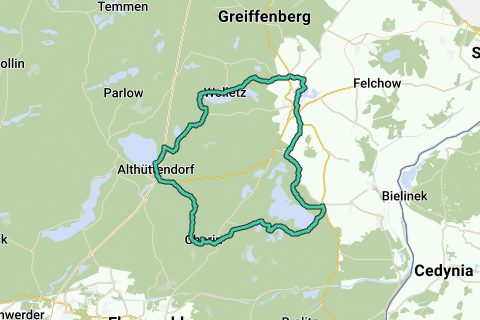 Rundturen starter ved Chorin station og går til Althüttendorf ved Grimnitzsøen. Man passerer ved vandrekirken og de tre skæbnegudinder i landsbyens midte og når derefter observationspunktet med udsigtsplatform, hvor man belønnes med en pragtfuld udsigt over søen. Turen fortsætter mod Neugrimnitz. Snart når man den imponerende naturskyttede UNESCO Verdensnaturarv Buchenwald Grumsin med nogle stigninger, og man forlader Barnimer Land mod Uckermark. Man kører til Altkünkendorf, hvis ottekantede tårn allerede kan ses på lang afstand. Ved Altkünkendorf landsbykirke informerer et infopunkt med en lille udstilling om mangfoldigheden i Buchenwald Grumsin. På en kastanievej, der er klassificeret som et gammelt naturmindesmærke, når man hurtigt til Wolletz og kører forbi den navngivne Wolletzsø. I Wolletz ses det tidligere jagtslot, som til 1960 var en jagtresidens for Erich Mielke og i dag huser en specialklinik. Turen går derefter mod Blumberger Mühle og krydser floden Welse. En omvej via NABU oplevelsescenter Blumberger Mühle og/eller Gut Kerkow med sin gårdbutik er bestemt værd. Næste stop er den charmerende by Angermünde med sin fredede gamle bydel. Små, snævre gader, kærligt restaurerede bindingsværkshuse og romantiske baggårde fortæller om svundne tider med imponerende historiske bygninger som Marienkirche eller franciskanerklosteret. Her bør man helt klart planlægge et stop og nyde atmosfæren, inden turen fortsætter mod Parsteiner Sø over Herzsprung til Parstein. På den let kuperede rute kan man nyde udsigten over det vidtstrakte, smukke område. Mellem Parstein og Brodowin har man en vidunderlig udsigt fra Rummelsberg over det isdannede landskab. Derefter fører den sidste etape tilbage til Chorin. Hvis der er tid, er et besøg i klosteret en krystalklar afslutning på denne tur.