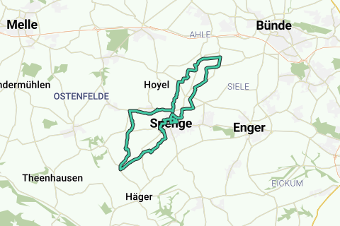 Ravensberger Hügelland med sin typiske "op og ned" af bækkene, Sieke og høje markarealer danner den røde tråd for denne cykelrute. I Spenge fører vejen forbi den middelalderlige Werburg og det imponerende slot Mühlenburg frem til Katzenholz. Den lille, bynære skov bruges til mange naturoplevelsesaktiviteter. Forbi Fahrenhölzer gårdene når du efter i alt 5,5 km ved Düttingdorfer Straße den højeste punkt på ruten (133 m over NN). Videre mod Baringdorf kan du ved Hof Heining beundre et gammelt dræningssystem til vanding og dræning af de bæknære enge. Gennem Wallenbrück og Nordspenge fører vejen kun få meter fra Niedersachsen langs Warmenau – en lille flod med en meget lang "grænsehistorie". Ved Hücker Moor, den eneste større sø i området, indbyder caféer ved søbredden til et besøg. På en gåtur eller fra en robåd kan du med lidt held observere nogle særlige vandfuglearter som dykænder, fiskehejre, grågås eller også sjældnere arter på træk. På de sidste 10 km af ruten når man med godt tempo vindmøllen i Hücker-Aschen. Derfra går turen tilbage til midten af Spenge, hvor der endnu er mange andre monumenter at besøge. Tilbage ved parkeringspladsen nær Werburger Waldbad tilbyder et besøg i svømmehallen en oplagt mulighed for at køle af.