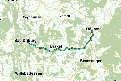 Den videre vej til Höxter går konstant let ned ad bakke og fører dig fra Riesel gennem Nethe-dalen og dens bifloder. Undervejs passerer du også den gamle hansestad Brakel og de Höxteranske lokaliteter Bruchhausen og Godelheim. De sidste kilometer fører dig langs Weser-floden til Höxter.