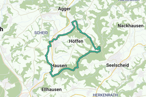 Vi kører venstre ind i Ingersauel og fortsætter op ad bakken over Saal til Oberstehöhe. Da vi når toppen, venter os nedkørslen over Grünenborn til Neuhonrath i Aggertal. I Neuhonrath drejer vi til venstre ind på Schachenaueler Straße (første stykke kun cykel-/gangsti). Forbi tennisbanerne (Pas på: Hastighedsgrænsen er 10 km/t) når vi snart et højtliggende område ved Agger og er allerede næsten fremme i Wahlscheid. Vi passerer en legeplads på højre side. Forbi plejehjemmet drejer vi til venstre ind på Wahlscheider Straße, hvor vi næsten kan se Forum.