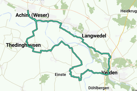 Start ved Clüverhaus i Achim. Det historiske landhus med det blå bindingsværk huser en dejlig, integrativ café. Mod Weser, forbi St.-Laurentius-kirken fører vejen gennem landbrugsbyen til Achimer vindmølle og til Brogade. På denne side af Weser, parallelt med Schwedenschanze, cykler du mod Baden. Fra restaurantterrassen på Badener Berg har du en god panoramaudsigt over marsken og sammensmeltningen af slusekanalen og Weser.