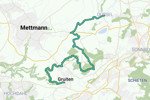 Sensationelt hurtigt vandrer man bag etape-starten ved S-Bahnhof Gruiten ind i Düsseltal frem til den idylliske bindingsværksby Gruiten-Dorf. Herefter går det gennem det beskyttede område Grube 7, en tidligere kalkstensgrube, ind i Osterholzer Wald. Derfra over de bakkede højder igen på smalle stier ind i Düsseltal frem til Schöller, stedet med Schinderhannesturm.