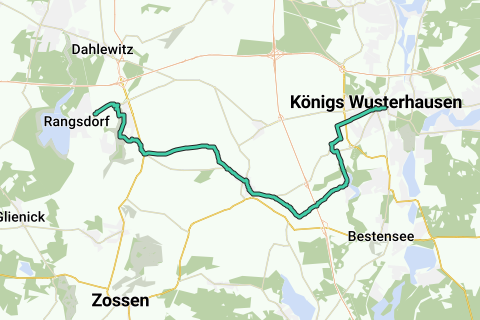Længde: fra Königs Wusterhausen til Mittenwalde 11,6 km, 3 til 4 timer fra Mittenwalde til Rangsdorf 10,7 km, 3 timer Start / Mål: Bahnhof Königs Wusterhausen Regionalbane RE, RB, S-Bahn Bahnhof Rangsdorf Regionalbane RE Rutevejledning: Königs Wusterhausen - Schenkendorf - Krummensee - Mittenwalde - Groß Machnow - Rangsdorf