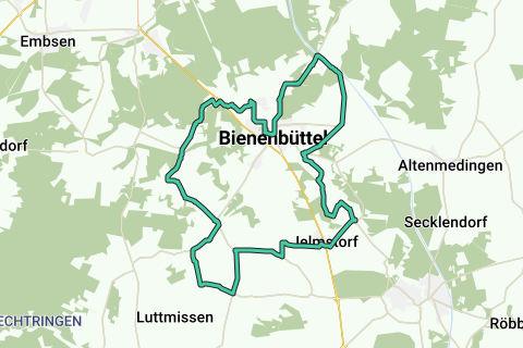I centrum af Bienenbüttel begynder rundturen. I Heidefloden Ilmenau, som vi krydser flere gange, lever den sjældne flodmusling stadig. Undervejs i Grünhagen er der en rygerip med lækre fiske-specialiteter. Fra Grünhagen fører vejen først gennem skoven, derefter åbner landskabet sig. På venstre hånd strækker et naturbeskyttelsesområde sig med elme- og askeskove, ege og bøge. I Eitzener Bach lever ørreden. Lige før Eitzen I ligger sandede brakområder og en sandgrave. Her kan man i foråret høre sangen fra hedelyrken. Fra Eitzen I cykler vi forbi naturbeskyttelsesområdet Schierbruch til Beverbeck mod Rieste. I Rieste blev der i 1890 opdaget et kæmpegrav med omkring 1000 urner af langobarder. På grund af rovdrift og krigsskader er disse og andre steder ikke længere til stede. Oplysninger og andre fund er bevaret i et lokalt familiesmuseum. Fra Rieste fører vejen over Bornsen til Oldendorf II. Her forkæler Wiesencaféen med hjemmebagte kager. I udkanten af Oldendorf II krydser vi Vahrendorfer Bach, derfra fortsætter vi til Natendorf. På halvvejen informerer et skilt om "Levested Ager". Fra Natendorf fører turen til Varendorf og derefter videre til Rockenmühle. Denne opstod formentlig i det 10. århundrede og blev genopbygget omkring 1840. Herfra er der kun et hop til Addenstorfer Heide. Det lille hedeområde rummer 45 gravhøje fra bronzealderen, som stadig er synlige i skov og hede. Efter "historietimen" i heden cykler vi til Jelmstorf og derfra delvist langs jernbanen og langs kanten af Ilmenautalen til Wichmannsburg. I Wichmannsburg ved kanustationen kan man tage en god pause. Derefter krydser vi Heidefloden, læser interessante oplysninger om beskyttelsesområdet på infoskiltet ved Ilmenaubroen og kigger på markstenkirken, som kan ses herfra. Fra Wichmannsburg fører vejen til Elbe-sidenkanalen. På venstre hånd breder fugtige elmeskove sig. Da vi når kanalen, krydser vi Vierenbach og cykler en strækning langs kanalen. Vi når naturbeskyttelsesområdet "Vierenbach" med fugtige skove og enge. De typiske elmesumpeskove kan ses lige fra vejen. Imellem drejer vi til venstre mod Niendorf og er snart tilbage i udgangsstedet Bienenbüttel.