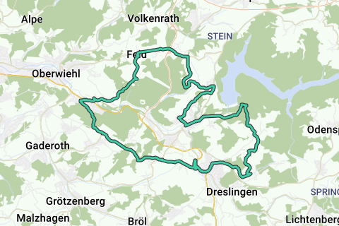 Vi følger "Brüderstraße" til Sterzenbach og klarer en stigning på cirka 8%, værestedet Heseln forbliver til venstre, vi når Schalenbach, og nu går det ned ad bakke. Vi fortsætter forbi dæmningen og vandværket Auchel. Efter en ca. 1 km lang lige strækning når vi landsbyen Brüchermühle, her drejer vi til venstre, cirka 200 m senere drejer vi til højre igen i retning mod de små steder Eueln, Fürken og Heischeid.