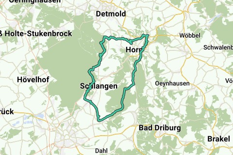 Vi fører dig fra startpunktet ADFC-Station Bad Meinberg på naturnære vejstræk og landbrugsveje til Silberbachtal. Derfra op ad skovveje til kammen (vanddelingen Weser / Rhein) af Teutoburger Wald / Eggegebirge og på en middelalderlig Hellweg-trace i retning mod Neuenbeken på den vestlige kant af bjerget. Du cykler ned til Bad Lippspringe ved kilden til Lippe og de seværdige parkområder. Følg vores rute på skjulte stier gennem den flade kulturlandskab i Senne til Fürstenallee med den historiske kro Kreuzkrug. Derfra bestiger du for anden gang kammen ved Teutoburger Wald på naturveje og ruller stejlt ned til kroen Hangstein ovenfor Berlebeck. Herfra er det værd at tage et kort afstikkere til Adlerwarte Berlebeck, derefter cykler du tilbage til startpunktet ad små veje og gennem markerne.